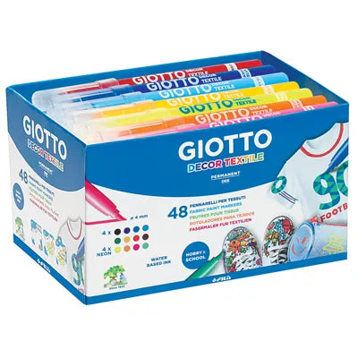 Pennino bloccato, tappo di sicurezza e cappuccio ventilato. Tutti i colori sono facilmente lavabili dalle mani. Per fissare meglio il colore si consiglia di passare il ferro da stiro tiepido sul decoro. La gamma è composta da 8 colori classici e 4 fluorescenti.