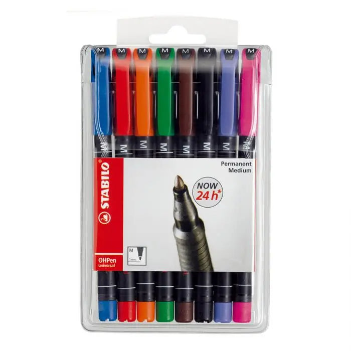 Fare presentazioni a scuola e al lavoro è più facile con STABILO OHPen universal! STABILO OHPen è la penna ad inchiostro permanente per tutte le superfici lisce, con impugnatura antiscivolo ondulata e cappuccio ventilato dotato di pratica clip. STABILO OHPen è estremamente versatile! Queste penne per lucidi sono le più amate dai grandi presentatori perché non macchiano e non sbavano sulle slide. Scrivono anche su quasi tutte le superfici più dure, per cui sono perfette per diversi tipi di utilizzo. STABILO OHPen dura fino a 3 giorni senza cappuccio ed è disponibile in 3 diverse ampiezze di tratto (S, F, M) e 8 diversi colori.