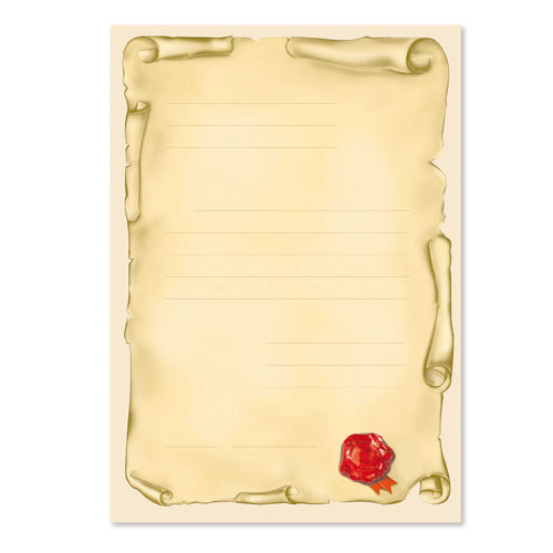 Carta tipo pergamena dall'effetto anticato impreziosita dal motivo stampato. Ideale per scrivere lettere, inviti, menù, diplomi sia a mano che con stampanti laser e a getto di inchiostro.