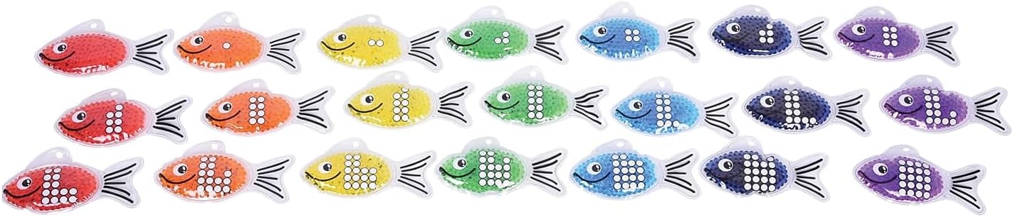 Set di 21 pesci color arcobaleno, numerati 0-20. Riempito con perline di gel sensoriali e confezionato in una scatola TickiT. Dimensioni: 80 x 150 mm. Concetti di numeri appesi: Questi pesci in gel arcobaleno sono dotati di fori nella parte superiore, pronti per essere appesi in modo che tutta la classe possa vedere e unirsi. Ideale per studenti tattili o visivi: Ogni pesce ha un numero su un lato e il valore numi con dall'altro. I bambini amano sentire le perline di gel all'interno del pesce mentre contano i numeri. Apprendimento luminoso e colorato: Il pesce viene fornito in una confezione da 21, numerata da 0 a 20 su un lato e i valori numi con dall'altro. I colori vivaci dell'arcobaleno mantengono i piccoli studenti impegnati.