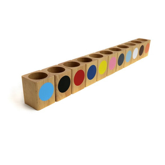 Serie di 11 contenitori in legno colorati, per matite di 11 colori corrispondenti.