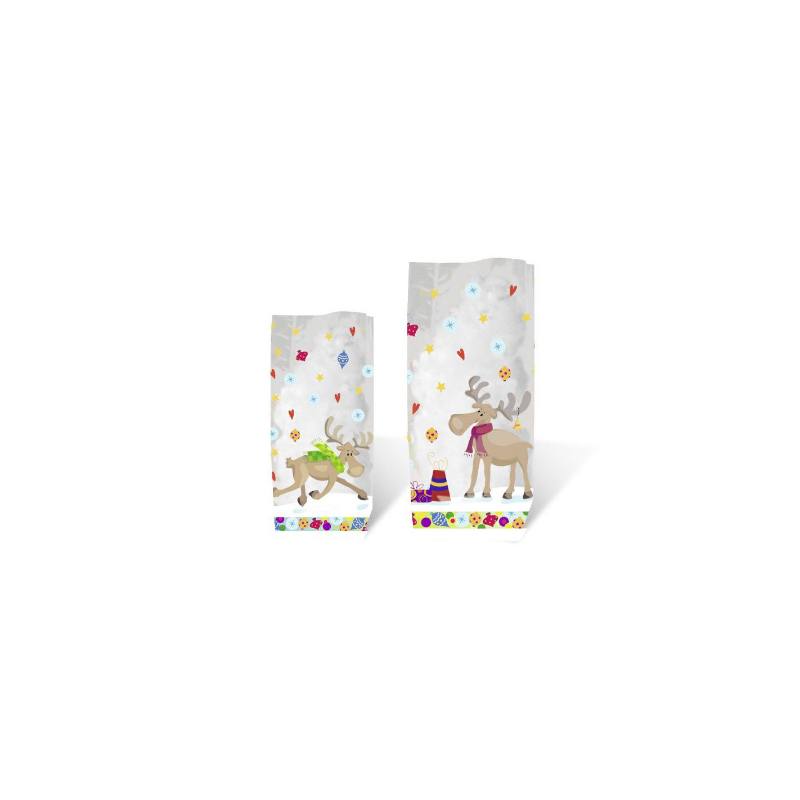 Confezione 10 sacchetti regalo con fondo in pellicola trasparente per alimenti nel formato 14,5 x 23,5 cm. Stampato con un motivo di alci.