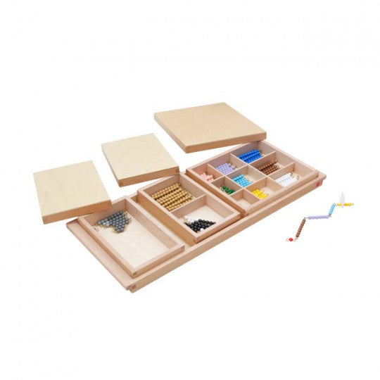Lo scopo di questo materiale è quello di introdurre il bambino alle varie combinazioni della sottrazione dei numeri 1-9. E' costituito da: una scatola di legno a 9 scompartimenti contenente 10 scale di perle colorate 1-9; 1 scatola di legno a 2 scompartimenti contenente 1 scala di perle bianche e nere 1-9 20 bastoncini di perle oro del 10; 1 scatola di legno contenente 5 scale di perle grigio chiaro-grigio scuro dei numeri negativi 1-9. Le 3 scatole sono contenute esattamente in un vassoio di legno.