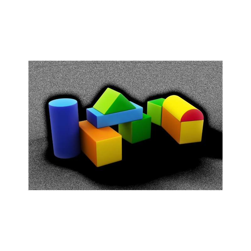 Set 8 moduli geometrici: 2 Cubi 40x40 cm, 2 Parallelepipedi 40x40x80 cm , 1 Cilindro 40x40x80 cm, 1 Tetto 40x40 cm, 1 Semi Cilindro 40x20x40 cm e 1 Trave 80x40x20 cm. Struttura interna in poliuretano espanso a cellula aperta. Densità : 16/21/25/30/40 kg/m3. Rivestimento esterno in ecopelle 100% in poliuretano INGNIFUGO CL.1. Pulire con sapone neutro o acqua e alcool al 20%. Colori assortiti a seconda della disponibilità in magazzino.