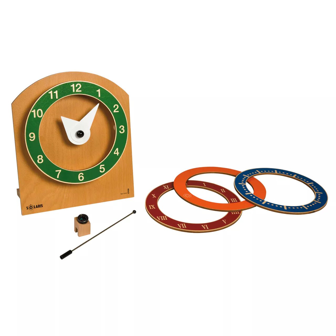 L'orologio Solaris trasforma la lettura dell'ora in un'attività creativa. I bambini possono costruire il proprio orologio utilizzando i componenti di Solaris. È un orologio unico e multiuso. Sono presenti diversi quadranti intercambiabili: numeri arabi, numeri romani divisi in minuti e una meridiana. Questi quadranti di orologio si trovano comunemente nella vita di tutti i giorni. L'introduzione del concetto di tempo in funzione del sole e della rotazione della terra apre ai bambini una percezione completamente nuova dei concetti di tempo e delle loro relazioni. La bussola in dotazione è necessaria per orientare l'orologio verso nord e introduce il concetto di direzione sulla superficie del pianeta (noto anche come nord ''magnetico''). Include: un orologio (37 x 31 x 10 cm), con vano portaoggetti per i quadranti, quattro quadranti intercambiabili in diversi colori (diametro 27 cm), due lancette rimovibili, un puntatore per meridiana, una bussola, un pennarello per lavagna e istruzioni.