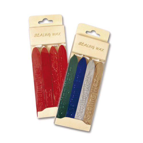 Confezione 4 stecche di ceralacca cm.10 con stoppino Colori Assortiti ( Verde, Blu, Argento e Oro).