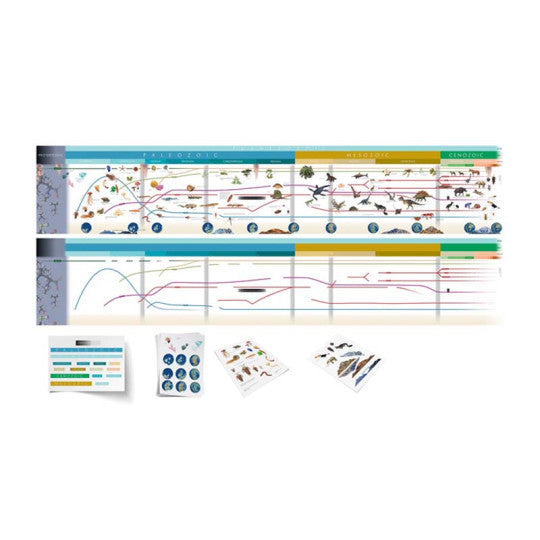 La Striscia dell’Evoluzione della Vita raffigura l’inizio della vita sulla terra dalle forme più semplici fino alla comparsa dell’uomo. La grande varietà e la magnificenza della vita è rappresentata attraverso vari organismi che hanno contribuito allo sviluppo degli esseri viventi in un vasto schema cosmico. Sono raffigurate varie ere: Paleozoico, Mesozoico e Cenozoico a partire dal regno di trilobiti fino alla comparsa dell’essere umano. L’insegnante indica sulla striscia quando sono apparsi i vertebrati, seguiti da pesci e piante, poi anfibi, rettili, uccelli e mammiferi. Questa linea del tempo è la base per le lezioni di chimica, la nutrizione, le categorie di animali e piante, la cura e le esigenze di diversi animali e la loro interrelazione con un ecosistema. Gli studenti vengono introdotti al linguaggio scientifico formale della zoologia, botanica e antropologia. Il set comprende 2 timeline: una di controllo con testo e immagini; una muta muta con linee e sfondo; cartellini stampati su materiale trasparente; etichette. Dimensioni: 46 x 275 cm