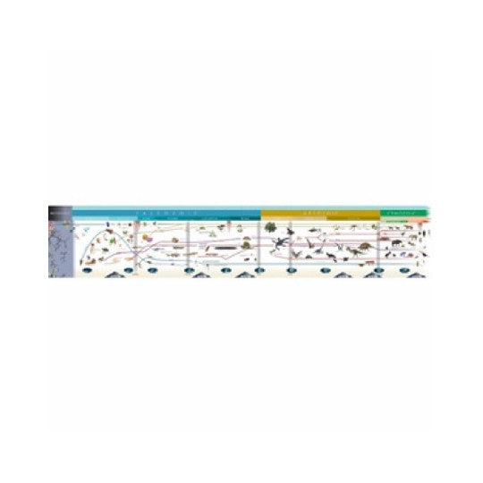 La Striscia dell’Evoluzione della Vita raffigura l’inizio della vita sulla terra dalle forme più semplici fino alla comparsa dell’uomo. La grande varietà e la magnificenza della vita è rappresentata attraverso vari organismi che hanno contribuito allo sviluppo degli esseri viventi in un vasto schema cosmico. Sono raffigurate varie ere: Paleozoico, Mesozoico e Cenozoico a partire dal regno di trilobiti fino alla comparsa dell’essere umano. L’insegnante indica sulla striscia quando sono apparsi i vertebrati, seguiti da pesci e piante, poi anfibi, rettili, uccelli e mammiferi. Questa linea del tempo è la base per le lezioni di chimica, la nutrizione, le categorie di animali e piante, la cura e le esigenze di diversi animali e la loro interrelazione con un ecosistema. Gli studenti vengono introdotti al linguaggio scientifico formale della zoologia, botanica e antropologia. Dimensioni: 46 x 275 cm