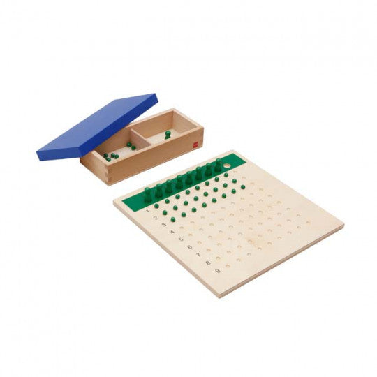 Utilizzando la Tavola della Divisione, il bambino si esercita sulla tavola della divisione, con dividendi da 1 a 81 e divisori da 1 a 9. Il materiale è costituito da: a) una tavola di legno con 81 cavità in 9 file di 9, con i numeri da 1 a 9 stampati sia nella parte superiore sia verticalmente lungo il lato sinistro; b) una scatola di legno con coperchio di colore blu contenente 81 perline verdi e 9 birillini verdi