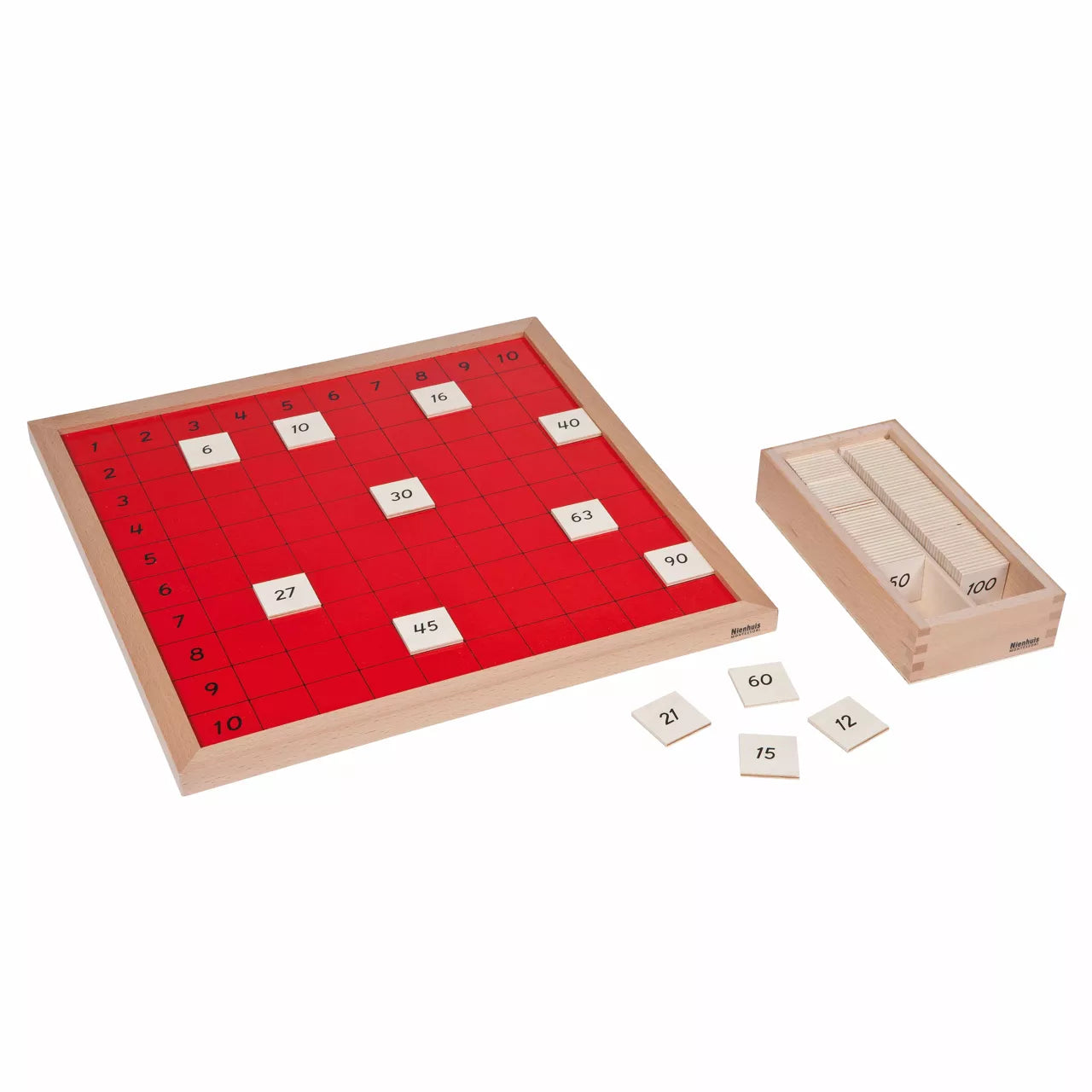 Un materiale utilizzato per insegnare le tabelline. Il materiale è costituito da una tavola di legno stampato con 100 caselle e una scatola con coperchio contenente 100 tombolini in plastica su cui sono stampate le risposte.