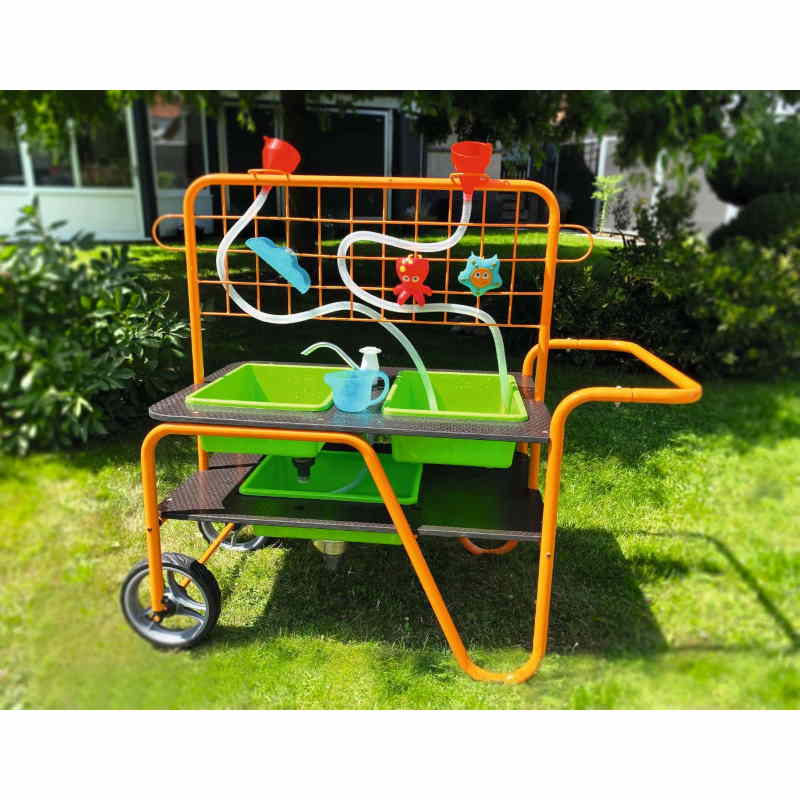 Esperienza di gioco interattiva progettata per i bambini che offre molteplici opportunità di gioco con acqua e sabbia. Ha due vasche principali dove i bambini possono versare acqua o sabbia e sperimentare con entrambi i materiali. Inoltre, include tubi, imbuti, bilancieri, una pompa e tre animali acquatici che aggiungono ulteriori opzioni di gioco. Il carrello è dotato di robuste ruote in gomma che lo rendono facile da trasportare anche su terreni accidentati, come prati o strade sterrate. Questo significa che può essere spostato facilmente all' interno o all' esterno, consentendo ai bambini di godere del gioco in diversi ambienti. E' altamente sensoriale e stimola i sensi dei bambini. Possono sperimentare con la consistenza, il flusso e il travaso di materiali, contribuendo allo sviluppo cognitivo e sensoriale.