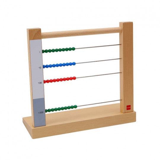 Il Telaio delle Gerarchie costituisce il ponte verso l'astrazione per gli esercizi di addizione e sottrazione. Telaio in legno con sostegno, costituito da 4 fili orizzontali, ciascuno con 10 perline nel colore gerarchico appropriato. Sul lato sinistro del telaio si trova una striscia bianca e grigia, ad indicare le famiglie dei numeri.