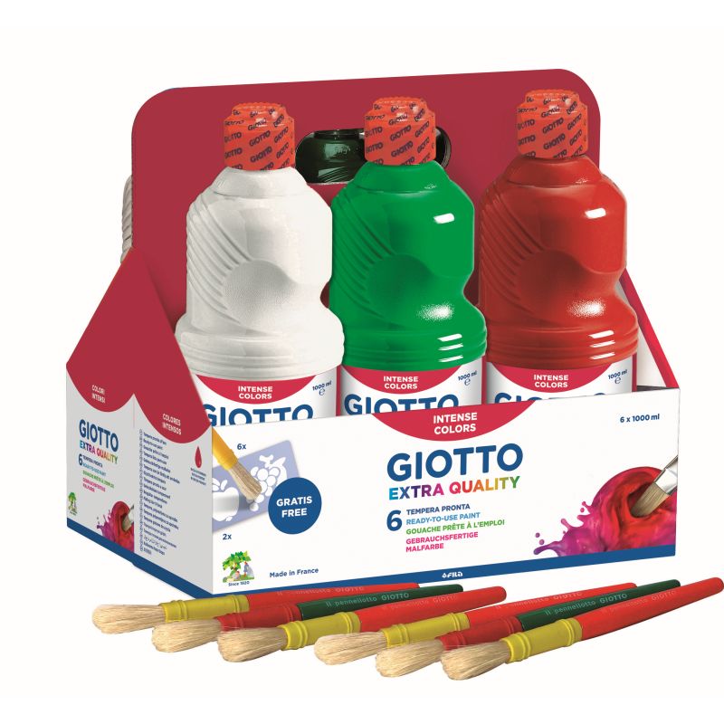 Tempera a base d'acqua, pronta all'uso, si lava facilmente dalle mani e dagli indumenti per creare in tutta libertà. Formulata con colori vivaci, sicuri e innocui. E' omogenea, compatta e facile da stendere. I Flaconi sono dotati di tappo dosatore anti spreco e di impugnatura ergonomica. I colori sono lavabili dalle mani con acqua e sapone e si rimuovono al 100% dal cotone e dalla maggior parte dei tessuti con ciclo di lavaggio in lavatrice a 40°C. Confezione 6 Flaconi Giotto School Paint da 1000 ml: Bianco, Giallo, Rosso, Verde, Blu e Nero.