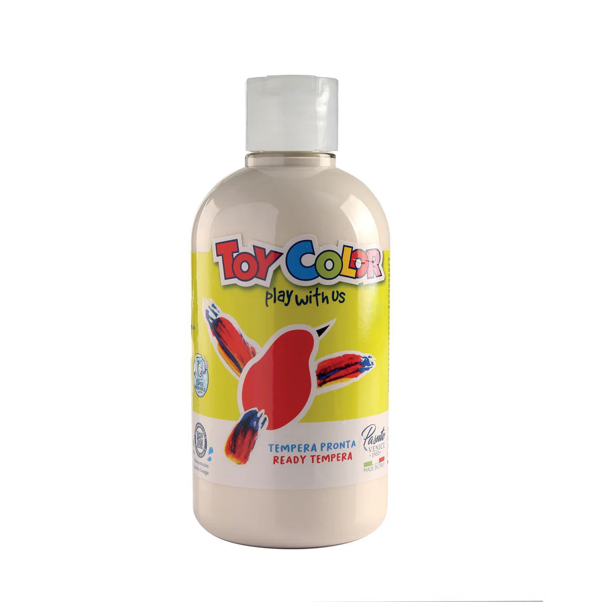 La tempera Toy Color è made in Italy, pronta all'uso e super lavabile dalle mani e dalla maggior parte dei tessuti, adatta ai bambini dai 3 anni di età. Si stende facilmente con il pennello senza doverla diluire con acqua.