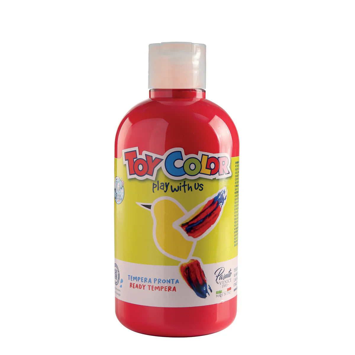 La tempera Toy Color è made in Italy, pronta all'uso e super lavabile dalle mani e dalla maggior parte dei tessuti, adatta ai bambini dai 3 anni di età. Si stende facilmente con il pennello senza doverla diluire con acqua.