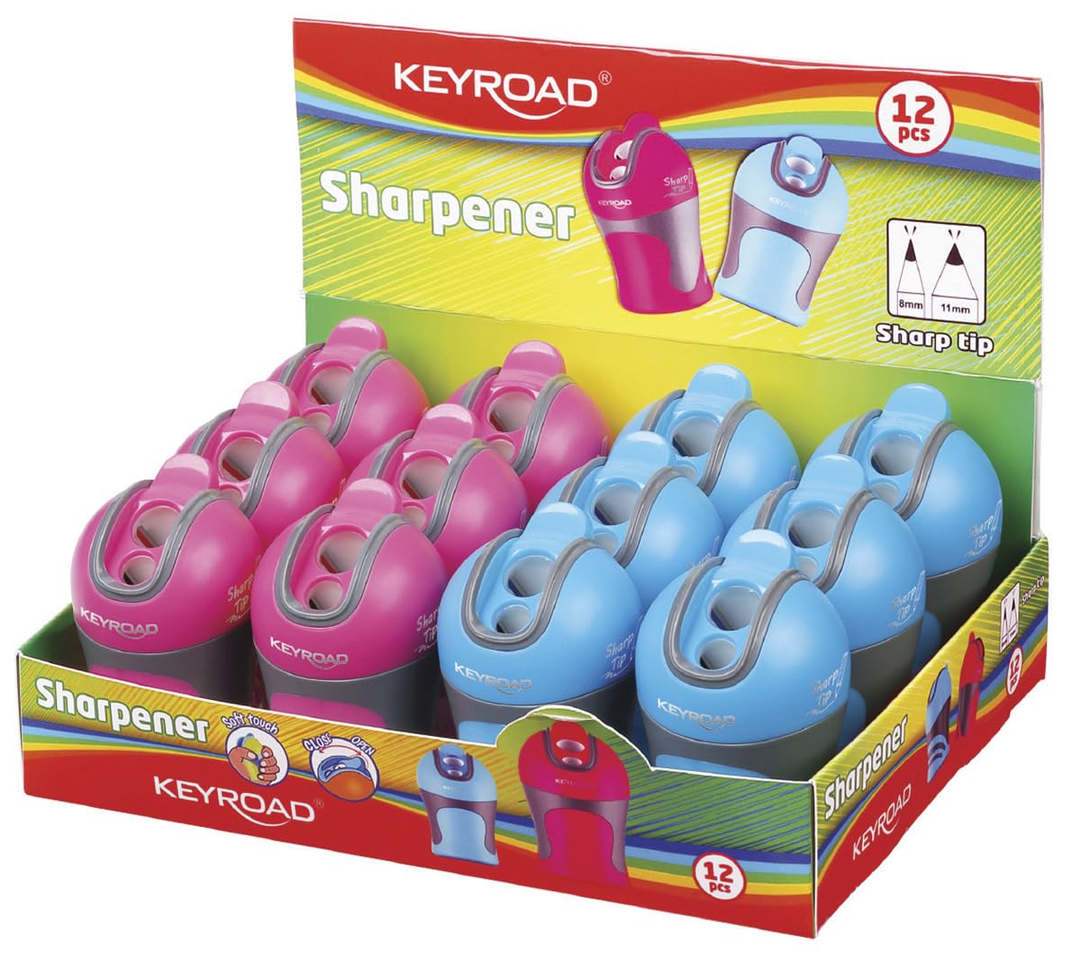 Confezione Scuola da 12 Temperamatite in colori assortiti.