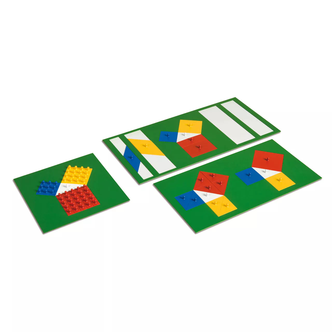 Questo set di materiale rappresenta tre casi del Teorema di Pitagora. Nel primo, due lati del triangolo sono uguali; nel secondo, i lati del triangolo sono nella proporzione 3:4:5; e nel terzo, viene mostrato il caso generale (la dimostrazione euclidea). Il materiale è costituito da 3 piastre metalliche verdi con fondi e inserti blu, rossi, gialli e bianchi.