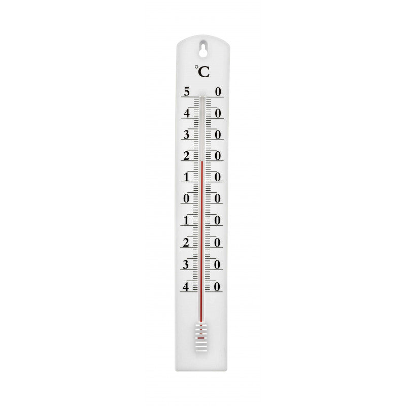 Termometro grande da interno ad alcool montato su base in polistirolo bianco. SCALA CELSIUS. Dimensioni: cm 39,5x6,2. Pratico foro per essere appeso con immensa facilità. Obiettivo educativo: misurare la temperatura interna ed esterna. Stimola l'apprendimento delle misure di temperatura.