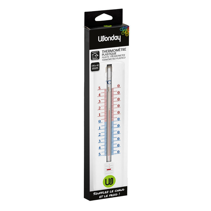 Termometro da interno ad alcool montato su base in polistirolo bianco. SCALA CELSIUS. Dimensioni: cm 19,5x4,2. Pratico foro per essere appeso con immensa facilità. Obiettivo educativo: misurare la temperatura interna ed esterna. Stimola l'apprendimento delle misure di temperatura.