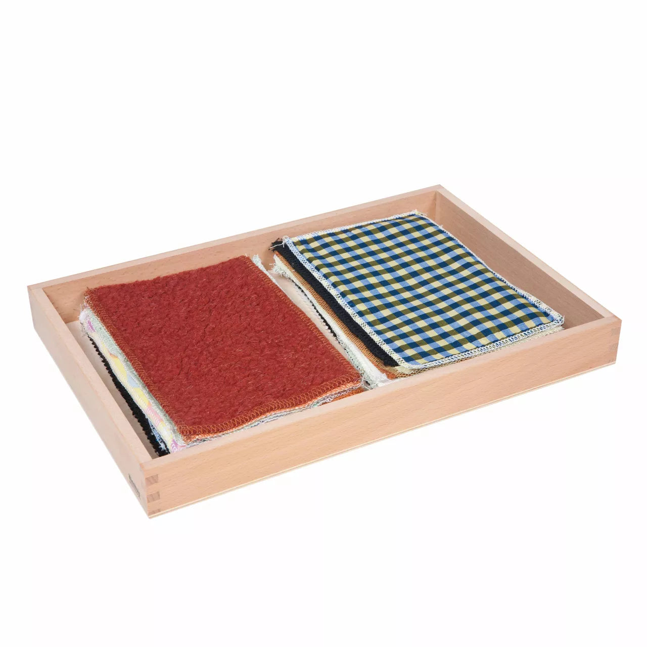 Attraverso il tatto, il bambino abbina i tessuti sulla base della variazione di texture. La scatola di legno è divisa in due scompartimenti e contiene tessuti in cotone, lana, juta, seta, pelle e sintetici.