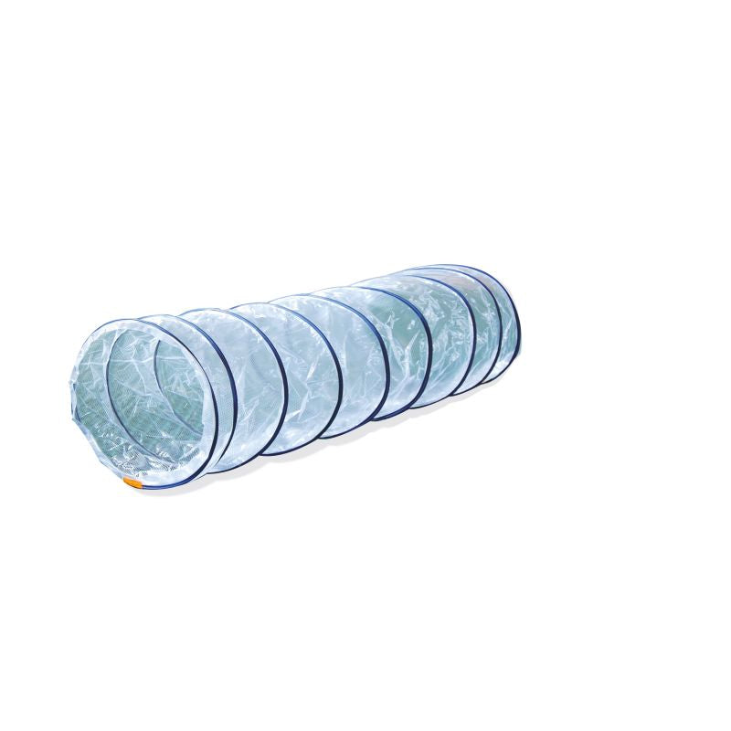 tunnel di nylon trasparente 180×60 cm. molto pratico, si apre in un secondo. non adatto a bambini di eta’ inferiore a 3 anni.